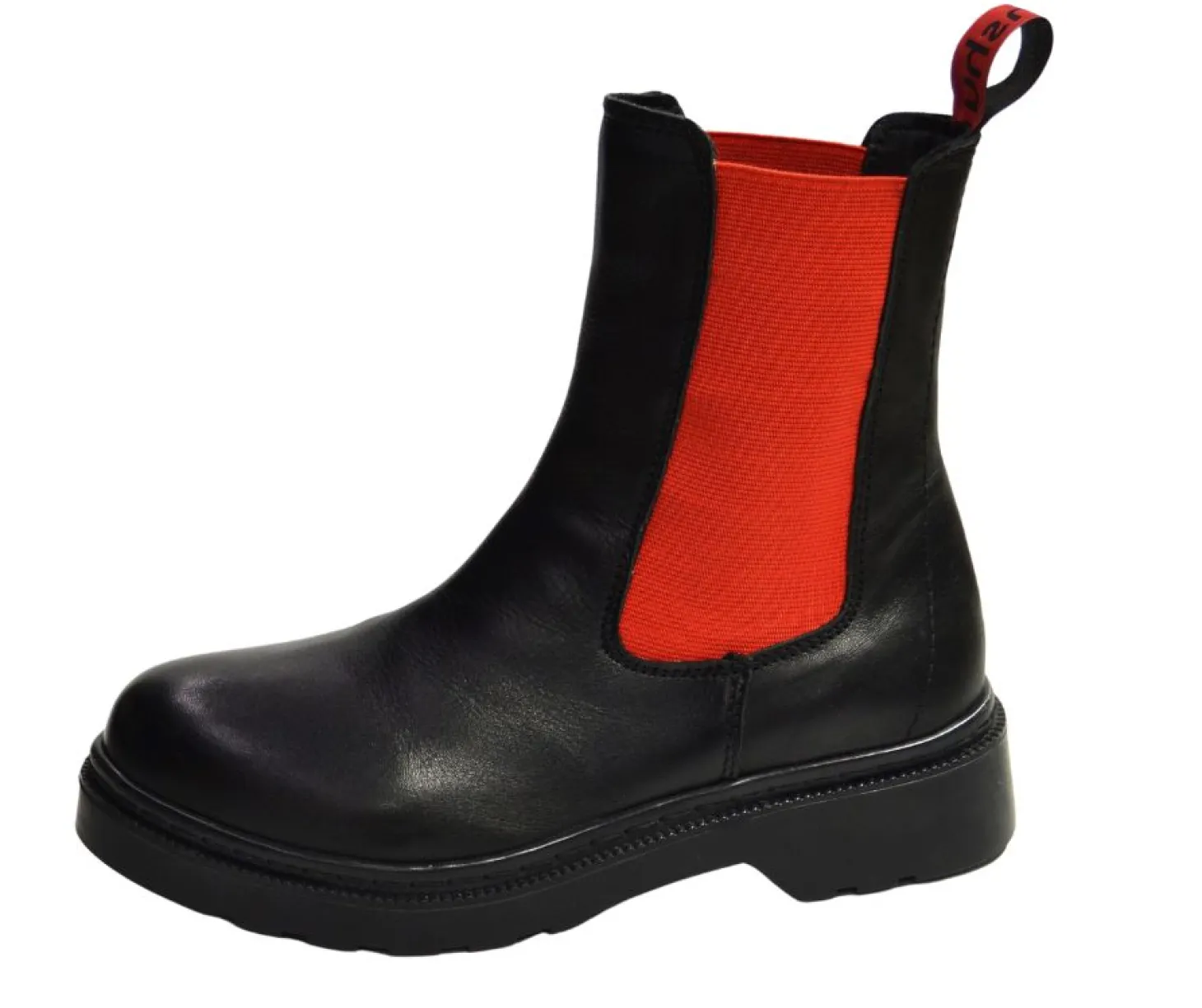 Trendikäs ja monikäyttöinen nilkkurimalli. Pinta pehmeää nahkaa, pehmeä sisäpohja ja kevyt vuori. Venykkeet helpottavat jalkaan laittoa. Tukeva pohja ja hyvä lesti. Tehostevärinä venykkeissä on näyttävää kirkkaan punaista.