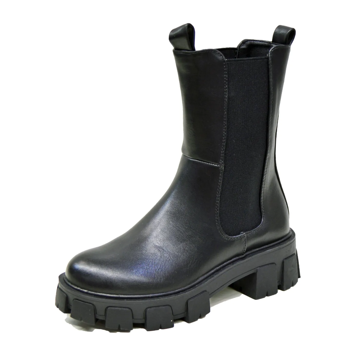 Trendikäs paksupohjainen nilkkurimalli. Pinta helppohoitoista keinonahkaa. Venykkeet helpottavat jalkaan laittoa. Ohut karvavuori.