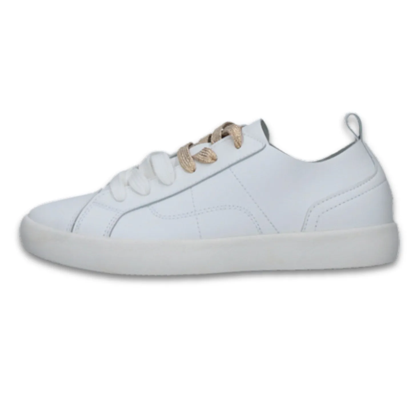 Monikäyttöinen nahkatennari nauhakiinnityksellä. Kenkien mukana saat kahdet eriväriset nauhat, joilla kengän ilmettä saa helposti muutettua. Pintamateriaali on laadukasta nahkaa, vuoreton malli. Todella kevyet jalassa. Väri on valkoinen, kultaisissa nauhoissa mukana kimallelankaa.
