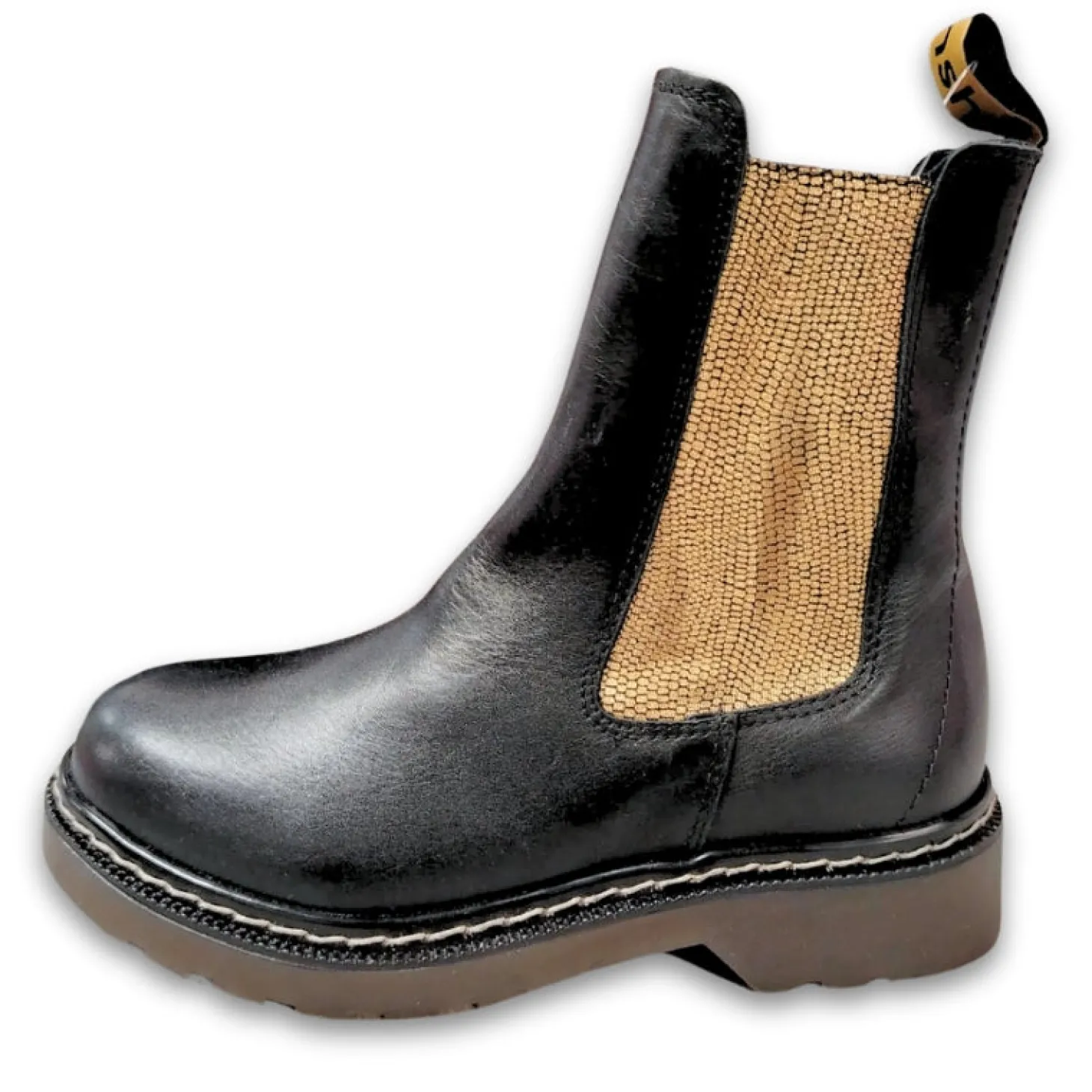 Trendikäs ja monikäyttöinen nilkkurimalli. Pinta pehmeää nahkaa, pehmeä sisäpohja ja kevyt vuori. Venykkeet helpottavat jalkaan laittoa. Tukeva pohja ja hyvä lesti. Venykkeissä näyttävä kultaprintti.